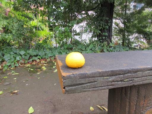 現在、構内で咲いている桜は幻の門の近くにある大寒桜ですが、福澤公園の梅もかなり散りながらもまだ少し花の風情を残しているので、季節の移り変わりがより感じられるなと思いながらベンチを見ると、夏みかんがポツンと置かれていました。